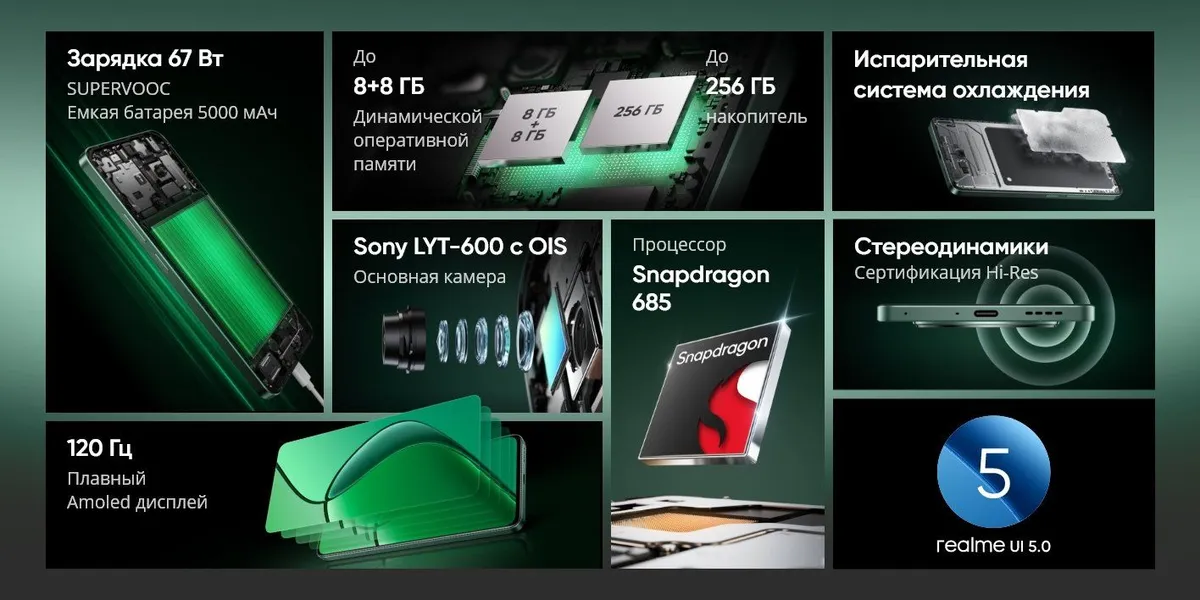 Смартфон Realme 12 8/256GB зелёный - это идеальный выбор для тех, кто ищет мощный и надежный телефон с большим объемом памяти. Этот смартфон оснащен процессором Snapdragon 685 (8 ядер), который обеспечивает быструю работу всех приложений и игр. Также он имеет оперативную память объемом 8 ГБ, что позволяет запускать несколько программ одновременно без замедления работы устройства.